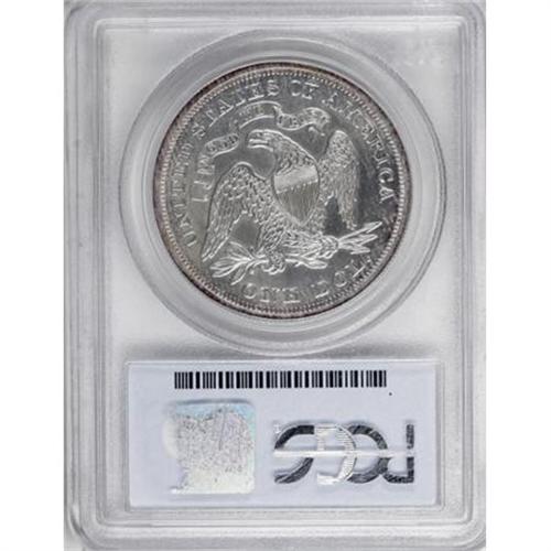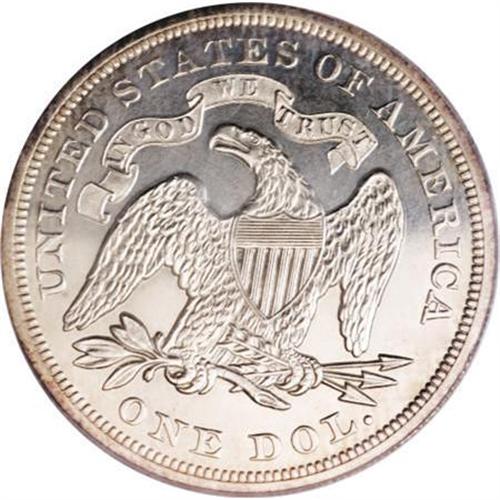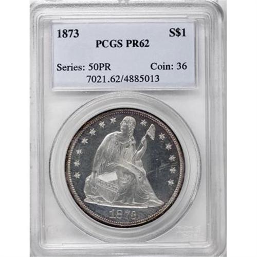 <B>1873 $1 PR62 PCGS.</B></I> The obverse has noticeable white-on-black contrast, although the reverse contrast is subdued. Nearly untoned, but hints of rose and mauve toning grace the rims. A sharply struck specimen with delicate obverse hairlines and a faintly granular streak near star 12. IN GOD WE TRUST and the feathers in the left (facing) wing are die doubled. A proof mintage of only 600 pieces closes the series.<BR><BR><B>Coin Engraver:</B> Christian Gobrecht<BR><BR><b>Shipping:</b> Coins & Currency (<a target="_blank" href="http://www.heritageauctions.com/common/shipping.php">view shipping information</a>)