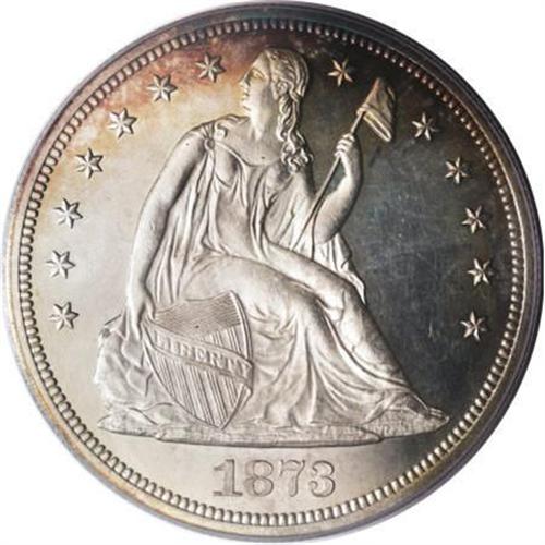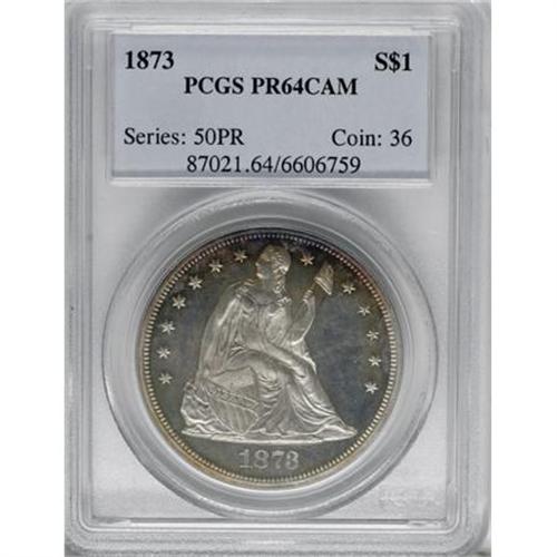 <B>1873 $1 PR64 Cameo PCGS.</B></I> Moderately reflective with exquisite detail and strong contrast, particularly on the reverse, which has orange and gold fields and frosty, untoned devices. On the obverse, purplish-pink and pumpkin-orange patina appears above Liberty's head, while light haze covers much of the rest of the coin. Population: 20 in 64 Cameo, 1 finer (10/07).<BR><BR><b>Shipping:</b> Coins & Currency (<a target="_blank" href="http://www.heritageauctions.com/common/shipping.php">view shipping information</a>)