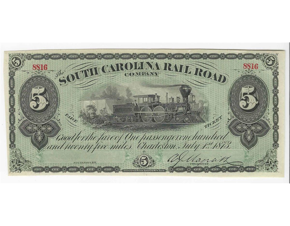 One 1873 $1 South Carolina Railroad Company Obsolete Note CU.