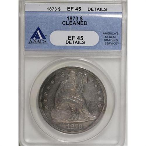 <B>1873 $1 --Cleaned--ANACS. XF45 Details.</B></I> NGC Census: (5/111). PCGS Population (19/119). Mintage: 293,000. Numismedia Wsl. Price for NGC/PCGS coin in XF45: $486. (#6971)<BR><BR><B>Coin Engraver:</B> Christian Gobrecht<BR><BR><b>Shipping:</b> Coins & Currency (<a target="_blank" href="http://www.heritageauctions.com/common/shipping.php">view shipping information</a>)