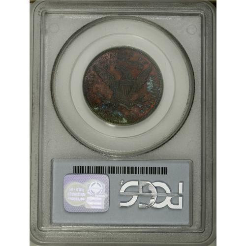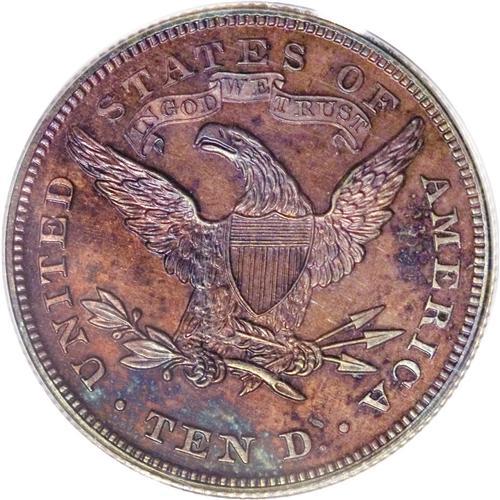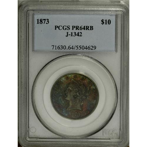 <B>1873 $10 Ten Dollar, Judd-1342, Pollock-1486, High R.7, PR64 Red and Brown PCGS.</B></I> The obverse and reverse are both the same design used to strike regular issue, 1873 Closed 3 eagles. Struck in copper with a reeded edge. This is an exceptionally rare pattern issue, one of just three or four believed to exist, including pieces that are gilt. This example has pale orange color with lilac, blue, and lime-green toning on each side.<BR><I>From The Jones Beach Collection.</B></I><BR><BR><b>Shipping:</b> Coin/Currency (<a target="_blank" href="http://www.heritageauctions.com/common/shipping.php">view shipping information</a>)