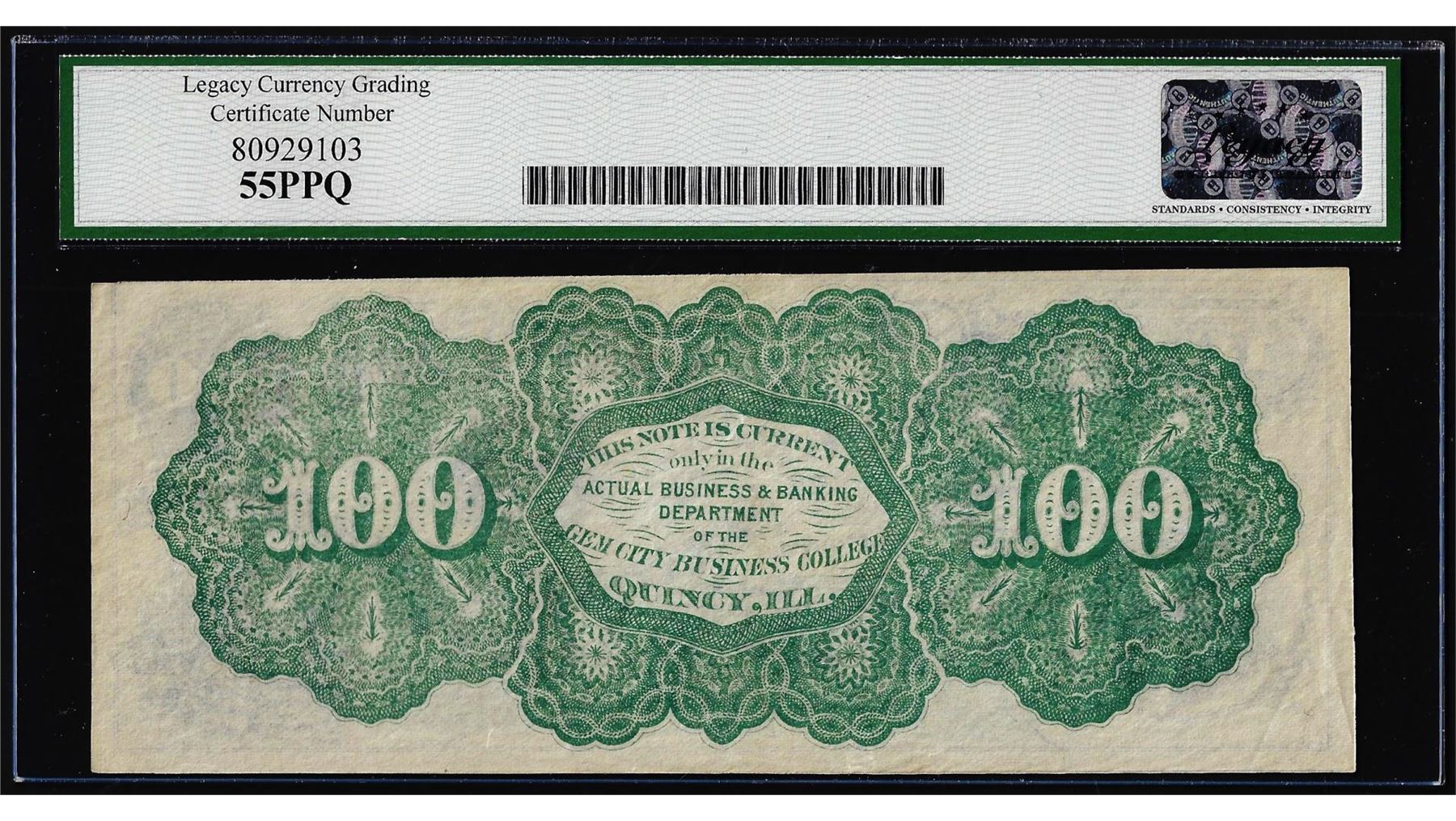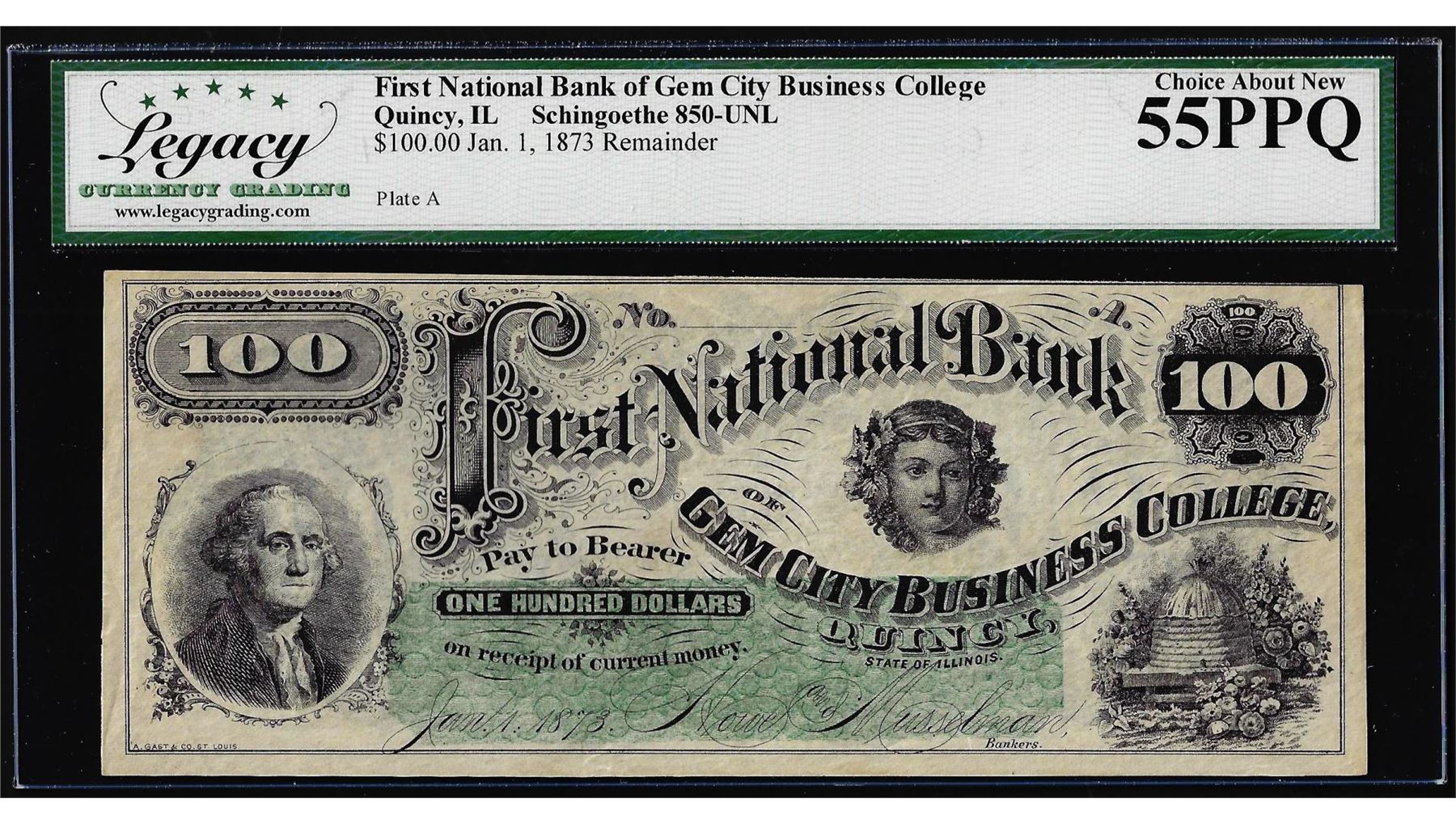 One 1873 $100 Gem City Business College Quincy IL Obsolete Note Legacy Ch. About New 55PPQ. Legacy Graded.