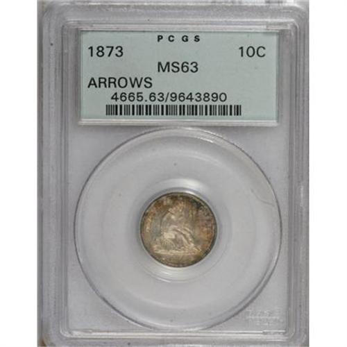 <B>1873 10C Arrows MS63 PCGS.</B></I> This lovely Select example shows strong detail and lovely luster. This captivating Arrows piece displays enticing peach, blue, and gold peripheral toning, while the centers are silver-gray. Population: 25 in 63, 42 finer (8/07).<BR><BR><B>Coin Engraver:</B> Christian Gobrecht<BR><BR><b>Shipping:</b> Coins & Currency (<a target="_blank" href="http://www.heritageauctions.com/common/shipping.php">view shipping information</a>)