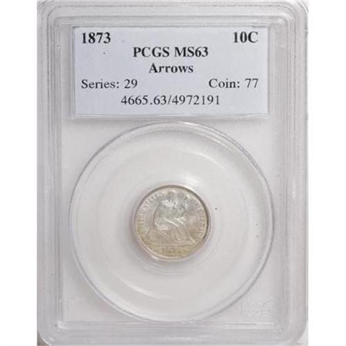 <B>1873 10C Arrows MS63 PCGS.</B></I> Lustrous and satiny, with an attractive mixture of silver and lilac coloration. The design features are bold, except for typical weakness on Liberty's head. A few pinscratches are noted on each side, limiting the grade. Population: 25 in 63, 43 finer (11/07).<BR><I>From The Casa Becca del Norté Collection.</B></I><BR><BR><B>Coin Engraver:</B> Christian Gobrecht<BR><BR><b>Shipping:</b> Coins & Currency (<a target="_blank" href="http://www.heritageauctions.com/common/shipping.php">view shipping information</a>)