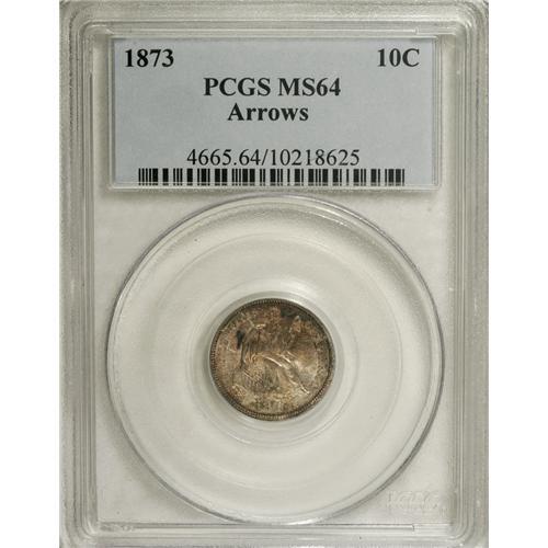<B>1873 10C Arrows MS64 PCGS.</B></I> Splashes of rose, plum, and gunmetal-gray add color to the obverse, while the reverse is largely silver-gray with hints of gold. A well-preserved and robustly struck example of this short-lived type. Population: 24 in 64, 16 finer (4/07).<BR><BR><b>Shipping:</b> Coins & Currency (<a target="_blank" href="http://www.heritageauctions.com/common/shipping.php">view shipping information</a>)