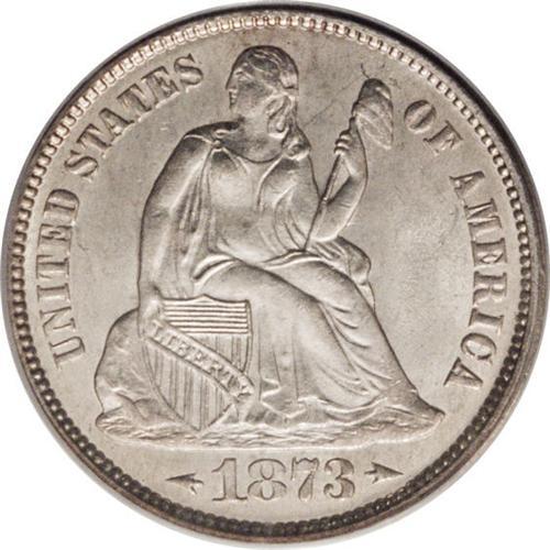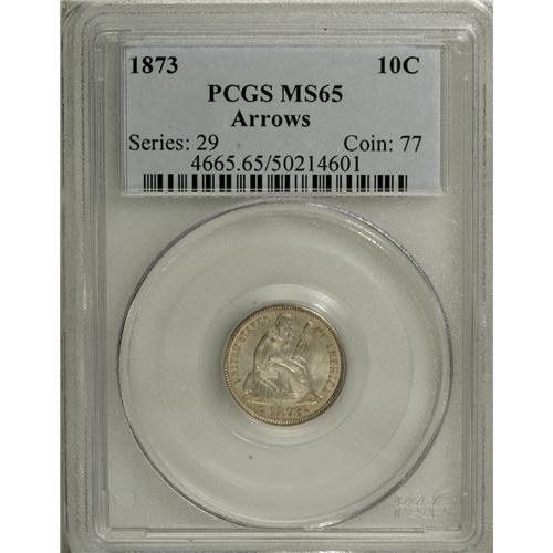 <B>1873 10C Arrows MS65 PCGS.</B></I> Fortin-112. An interesting die scratch (as made) on the lower right portion of the wreath identifies the variety. Light apricot toning drapes the borders of this lustrous and crisply impressed type coin. Lovely eye appeal despite a few minor field marks. Population: 12 in 65, 4 finer (12/06).<BR><BR><b>Shipping:</b> Coin/Currency (<a target="_blank" href="http://www.heritageauctions.com/common/shipping.php">view shipping information</a>)
