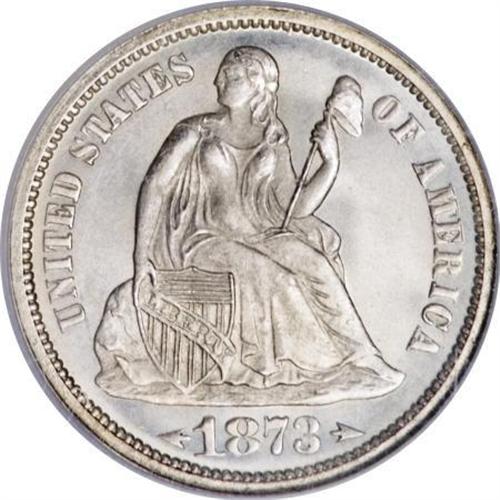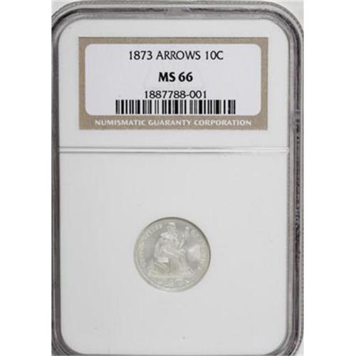 <B>1873 10C Arrows MS66 NGC.</B></I> Unlike with the 1853 and 1854 Arrows dimes, which were hubbed, the 1873 Arrows dimes had the arrows manually punched into the dies, leading to variations in size and placement. This piece shows the left arrow somewhat smaller than the right. Silver, satiny surfaces show no hint of color, but there is good field-device contrast. Brilliant luster radiates from both sides. A nice type coin, and among the finest certified at both services! Census: 4 in 66, 0 finer (1/08).<BR><I>From The Southwest Collection.</B></I><BR><BR><B>Coin Engraver:</B> Christian Gobrecht<BR><BR><b>Shipping:</b> Coins & Currency (<a target="_blank" href="http://www.heritageauctions.com/common/shipping.php">view shipping information</a>)