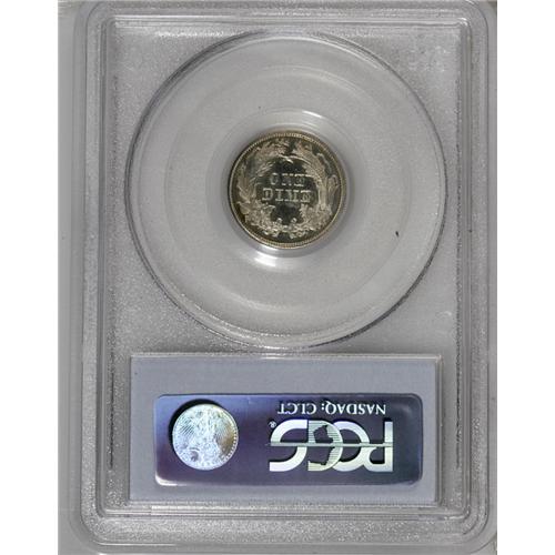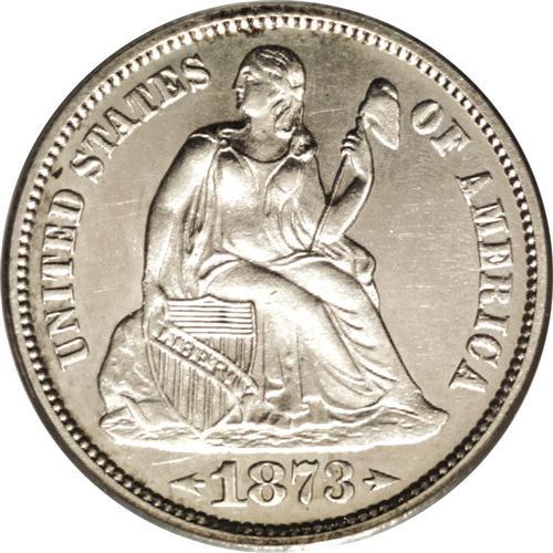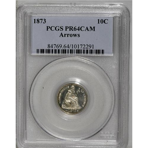 <B>1873<10C> Arrows PR64 Cameo PCGS.</B></I> Mildly cameoed with a thin veil of silver patina that does not subdue the bright, underlying reflectivity. The two-year 1873-74 Arrows issues have a very low total proof production. Population: 4 in 64 Cameo, 4 finer (7/06).