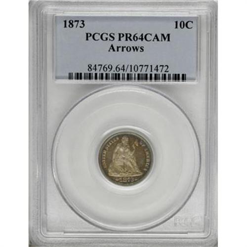 <B>1873 10C Arrows PR64 Cameo PCGS.</B></I> A lovely Choice Proof exemplar of this short-lived type, boldly impressed with rich bronze toning over much of the shining surfaces. The upper obverse shows a crescent of cornflower-blue, and the reverse displays a ring of similar patina. Population: 5 in 64 Cameo, 4 finer (8/07).<BR><BR><b>Shipping:</b> Coins & Currency (<a target="_blank" href="http://www.heritageauctions.com/common/shipping.php">view shipping information</a>)