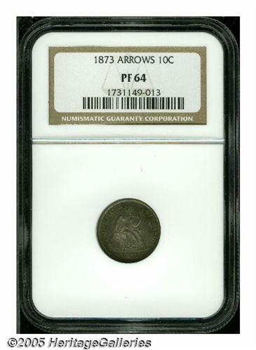 <B>1873<10C> Arrows PR64 NGC.</B></I> Iridescent green, violet, and golden-brown patina adorns each side of this attractive near-Gem. If not for a soft strike, the piece would probably grade even higher. The surfaces are well preserved, showing only a single small contact mark, in the right obverse field, just below the AM in AMERICA. Only 800 proofs were struck, and this is one of only two proof issues that belong to the No Stars, With Arrows type. Population: 29 in 64, 30 finer (6/05).<BR><I>From The Melrose Bay Collection.</B></I>
