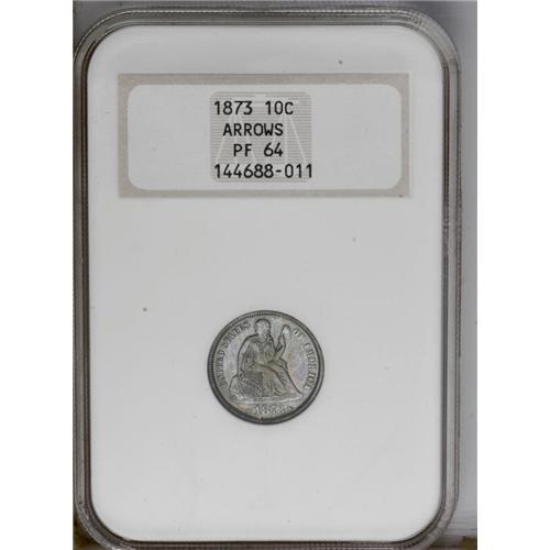 <B>1873<10C> Arrows PR64 NGC.</B></I> Powder-blue, peach, and aqua blushes endow this lovely near-Gem. A scarce, short-lived proof type. Certified in an early generation holder. Census: 40 in 64, 35 finer (4/06).