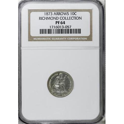 <B>1873 10C Arrows PR64 NGC.</B></I> Ex: Richmond Collection. The Arrows, Obverse Legend proof subtype is very scarce, as it was struck for just two years. Untoned and attractive with a suitable strike and a hint of cameo contrast. Census: 30 in 64, 25 finer (1/08).<BR><I>Ex: Richmond Sale, Part III (David Lawrence, 3/05), lot 1267.</B></I><BR><BR><B>Coin Engraver:</B> Christian Gobrecht<BR><BR><b>Shipping:</b> Coins & Currency (<a target="_blank" href="http://www.heritageauctions.com/common/shipping.php">view shipping information</a>)