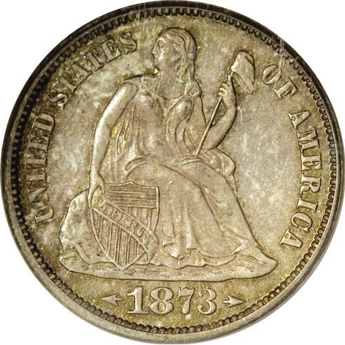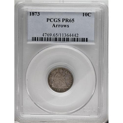 <B>1873 10C Arrows PR65 PCGS.</B></I> Sharply struck with a layer of original toning over each side that changes from mostly mauve-gray on the obverse to primarily steel-green on the reverse. Both sides are contact-free and devoid of hairlines. This two-year type was created with arrows alongside the date to signify a slight increase in weight for the Seated Liberty dime. Population: 16 in 65, 6 finer (2/07).<BR><BR><b>Shipping:</b> Coins & Currency (<a target="_blank" href="http://www.heritageauctions.com/common/shipping.php">view shipping information</a>)