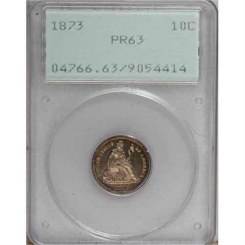 <B>1873 10C No Arrows, Closed 3 PR63 PCGS.</B></I> PCGS Population (51/67). NGC Census: (25/78). Mintage: 1,100. Numismedia Wsl. Price for NGC/PCGS coin in PR63: $350. (#4766)<BR><BR><B>Coin Engraver:</B> Christian Gobrecht<BR><BR><b>Shipping:</b> Coins & Currency (<a target="_blank" href="http://www.heritageauctions.com/common/shipping.php">view shipping information</a>)
