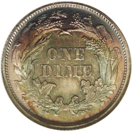 <B>1873<10C> No Arrows, Closed 3 PR65 NGC.</B></I> Walter Breen (1988) writes that some of the 600 1873 No Arrows proof dimes (some researchers suggest that 1,100 were minted) were melted on July 10, 1873. In any event, specimens in the higher grades are difficult to come by. This PR65 example displays luminous surfaces covered in an array of cobalt-blue, yellow-gold, and lavender toning. The design elements are better struck than is typical for the issue, especially on Liberty's head. A couple of barely discernible linear marks on each side do not detract in the least from the coin's overall eye appeal. Census: 24 in 65, 11 finer (4/06).<BR><I>From The Lewis (Tahoe) Collection.</B></I>