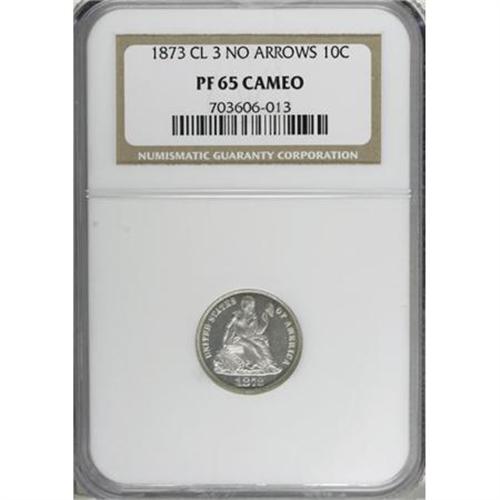 1873 10C No Arrows PR65 Cameo NGC. Closed 3. An enticing Gem specimen from an issue of 1,100 pieces. This faintly hazy example sports strong contrast and the Closed 3 logotype, like all No Arrows proofs for the year. Census: 1 in 65 Cameo, 4 finer (8/07).<BR><BR><b>Shipping:</b> Coins & Currency (<a target="_blank" href="http://www.heritageauctions.com/common/shipping.php">view shipping information</a>)