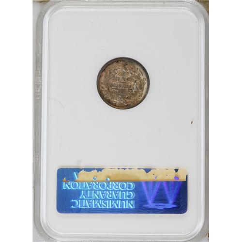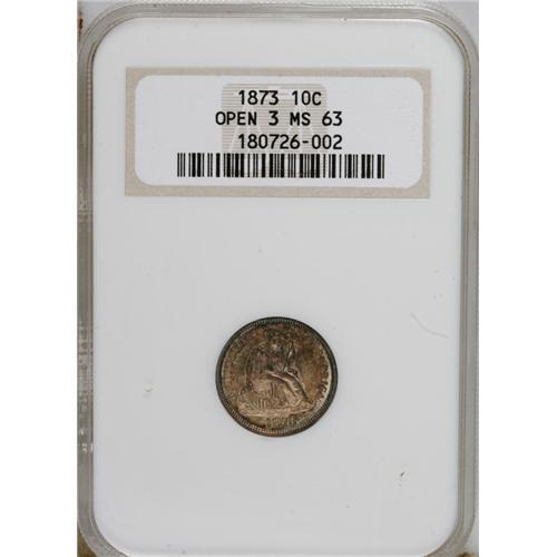 <B>1873 10C Open 3, No Arrows MS63 NGC.</B></I> Golden-brown toning is predominant, although aquamarine splashes emerge near the borders. A satiny and suitably struck example of this scarce, low mintage issue. Census: 4 in 63, 4 finer (1/07).<BR><BR><b>Shipping:</b> Coins & Currency (<a target="_blank" href="http://www.heritageauctions.com/common/shipping.php">view shipping information</a>)