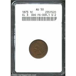 1873 1C Closed 3 AU50 ANACS. FS-9.1, Snow-2. LIBERTY is lightly die doubled east. While not as spectacular as the Guide Book variety FS-9, which is die doubled southwest, this variety nonetheless commands a five star interest designation in Cherrypickers'. The reverse has only a hint of verdigris, and this bold and refreshingly unabraded example will certainly please the specialist. Important notice: We expect to be auctioning lots at the rate of 200-250 per hour. Sometimes eBay Premier live bid software cannot keep up with that pace, so we strongly recommend that you place a realistic proxy bid now as insurance to avoid disappointment. Also please note that all Heritage/CAA lots purchased through eBay Premier carry a 20% Buyer's Premium. Please make sure you read the Terms and Conditions.