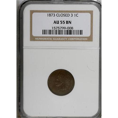 <B>1873 1C Closed 3 AU55 NGC.</B></I> NGC Census: (20/146). PCGS Population (6/29). Numismedia Wsl. Price for NGC/PCGS coin in AU55: $225. (#2109)<BR><BR><B>Coin Engraver:</B> James B. Longacre<BR><BR><b>Shipping:</b> Coins & Currency (<a target="_blank" href="http://www.heritageauctions.com/common/shipping.php">view shipping information</a>)