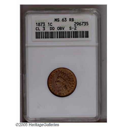 <B>1873<1C> Closed 3 MS63 Red and Brown ANACS.</B></I> FS-009.1, Snow-2. Doubled Die Type Two. LIBERTY is die doubled, although not as spectacularly as the more famous FS-009 variety listed in the <I>Guide Book.</B></I> Original gold color frames dusky olive and tan toning. Nearly void of contact, the grade is apparently limited by a few tiny carbon flecks on the reverse, and some striking softness on the shield.