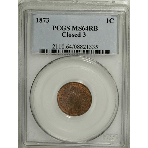 <B>1873 1C Closed 3 MS64 Red and Brown PCGS.</B></I> A pleasing woodgrain effect is observed on each side of this lustrous near-Gem. Well struck and nearly blemish-free, except for a couple of trivial nicks near the reverse center. Much scarcer than the Open 3 variety of this issue. Population: 53 in 64, 21 finer (4/07).<BR><BR><b>Shipping:</b> Coins & Currency (<a target="_blank" href="http://www.heritageauctions.com/common/shipping.php">view shipping information</a>)