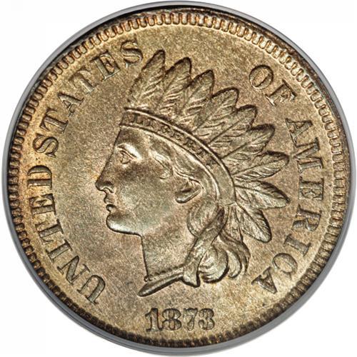 <B>1873<1C> Closed 3 MS64 Red and Brown PCGS.</B></I> FS-009.1, Snow-2. LIBERTY is die doubled, although not as spectacularly as on the famous FS-009 variety listed in the <I>Guide Book.</B></I> This beautiful near-Gem displays autumn-gold and olive iridescence. Nicely struck save for some softness on the top of the shield.