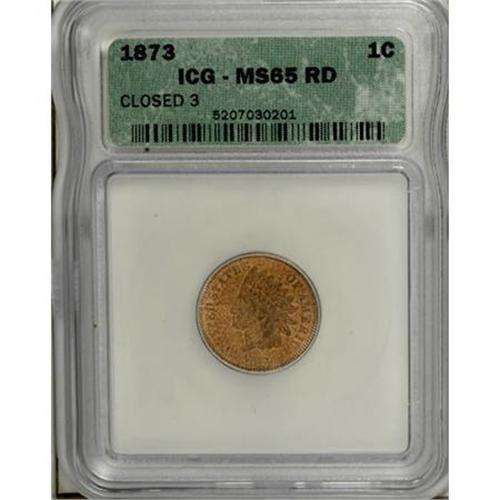 <B>1873 1C Closed 3 MS65 Red ICG.</B></I> While atypical in terms of the presence of full mint red on this coin, both sides display the usually seen streakiness inherent in the improperly mixed alloy for this year. Well struck with lovely, problem-free surfaces. Only slight spotting is noticed (with magnification) and that is significantly subdued by the streakiness.<I><BR>From The Santa Fe Collection.</B></I><BR><BR><B>Coin Engraver:</B> James B. Longacre<BR><BR><b>Shipping:</b> Coins & Currency (<a target="_blank" href="http://www.heritageauctions.com/common/shipping.php">view shipping information</a>\)