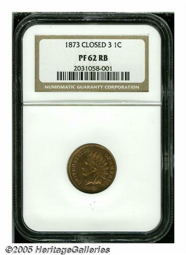 <B>1873<1C> Closed 3 PR62 Red and Brown NGC.</B></I> All 1873 Indian cents in Proof format are from the Closed 3 logotype. In fact, this is true about nearly all denominations for the year. This is because Proof dies were typically produced very early in the year (regardless of when the coins were actually struck), and in 1873, were produced before the change to the new Open 3 logotype. This example is sharply defined and has a lovely display of mint-red color, along with a small degree of streaky toning on each side.