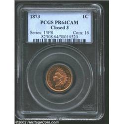 1873 1C Closed 3 PR64 Cameo PCGS. Formerly offered as lot 5392 in our 2002 September Long Beach Sale, where it was described as, "The surfaces show evidence of overzealous die polishing as the bottom of the top feather on the headdress has been partially polished away. This heavy die polishing did create a brightly mirrored backdrop for the mint frost seen on the devices, which gives the coin cameo contrast. Bright, even red color over both sides with a few speckles of deeper color at the top of the obverse." Population: 2 in 64, 1 finer (10/02). Important notice: We expect to be auctioning lots at the rate of 200-250 per hour. Sometimes eBay Premier live bid software cannot keep up with that pace, so we strongly recommend that you place a realistic proxy bid now as insurance to avoid disappointment. Also please note that all Heritage/CAA lots purchased through eBay Premier carry a 20% Buyer's Premium. Please make sure you read the Terms and Conditions.