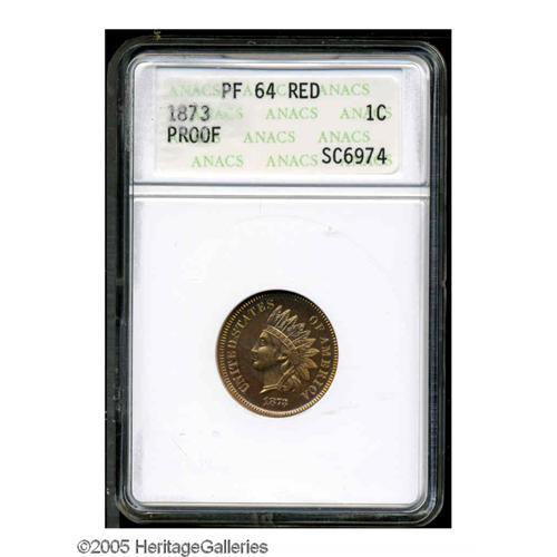 <B>1873<1C> Closed 3 PR64 Red ANACS.</B></I> A lovely, well struck near-Gem with salmon-pink color on the obverse, cherry-red toning on the reverse, and only a trace of obverse carbon. The mirrors display excellent reflectivity.