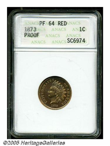 <B>1873<1C> Closed 3 PR64 Red ANACS.</B></I> This is a crisp, problem-free example of this popular and coveted date in the Indian cent series. A lovely near-Gem with salmon-pink color on the obverse, cherry-red toning on the reverse, and beautifully preserved surfaces. Portions of the headdress are absent, as struck due to polished dies.