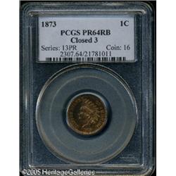 <B>1873 1C Closed 3 PR64 Red and Brown PCGS.</B></I> Amazingly deep purple-red and golden patina blankets each side of this well preserved near-Gem. The striking details seem flawless, and the obverse and reverse surfaces are mark-free. Lot:5297