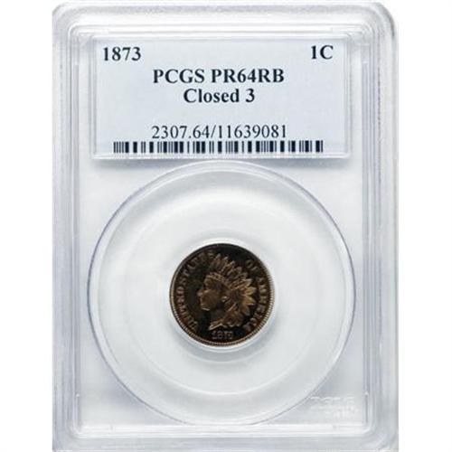 <B>1873 1C Closed 3 PR64 Red and Brown PCGS.</B></I> This is a well struck near-Gem proof with highly reflective fields and rich red-brown coloration. Several faint lint marks are observed near OF, on the upper right obverse periphery. A wispy slide mark across Liberty's cheek and jaw limits the grade. <BR><I>From The Madison Collection.</B></I><BR><BR><B>Coin Engraver:</B> James B. Longacre<BR><BR><b>Shipping:</b> Coins & Currency (<a target="_blank" href="http://www.heritageauctions.com/common/shipping.php">view shipping information</a>)