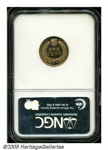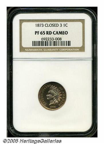 <B>1873<1C> Closed 3 PR65 Red Cameo NGC.</B></I> Closed 3 logotype as found on all Proof Indian cents of this date. This is a lovely Gem Proof with brilliant copper-pink color on each side. The obverse is accented by pink and iridescent toning while the reverse is considerably brighter. A light cameo contrast adds to the overall look of this Gem. This is the only example certified as a fully brilliant cameo by NGC.