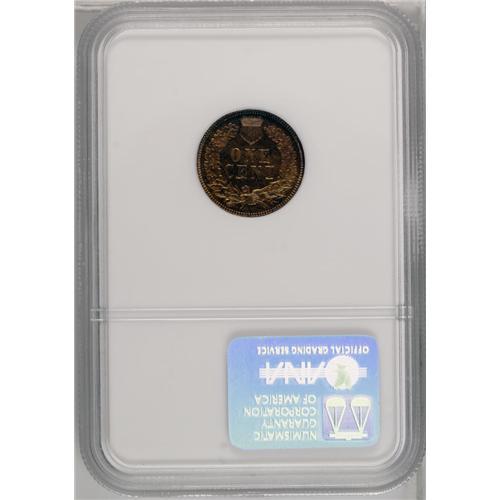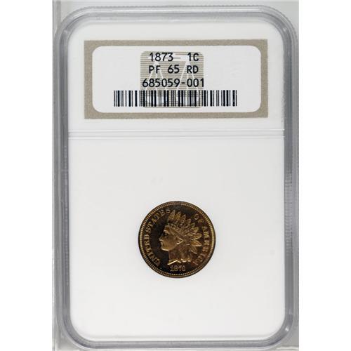 <B>1873<1C> Closed 3 PR65 Red NGC.</B></I> At least 1,100 proof 1873 Indian cents were produced, all of which display a Closed 3 in the date. Since the business strike Closed 3 cent is a challenging coin to locate in all Mint State grades, proofs are often called upon to represent the issue in specialized collections. As a fully lustrous Gem, however, the present specimen is an important and rare coin in its own right. Glassy fields form a splendid backdrop to the sharp, fully brought up devices. The otherwise orange-red color yields to faint lilac highlights at portions of the reverse border. With no mentionable blemishes, this coin is accurately graded at the present level. Census: 4 in 65, 2 finer (3/06).
