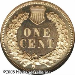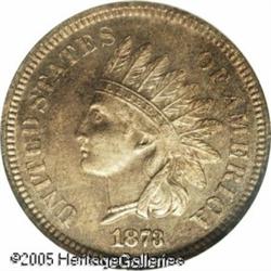 <B>1873 1C Closed 3 PR65 Red NGC.</B></I> Closed 3 logotype as found on all Proof Indian cents of this date. This is a lovely Gem Proof with brilliant copper-pink color on each side. The obverse is accented by pink and iridescent toning while the reverse is considerably brighter. A light cameo contrast adds to the overall look of this Gem. Population: 5 in 65, 2 finer (1/05). Lot:5300