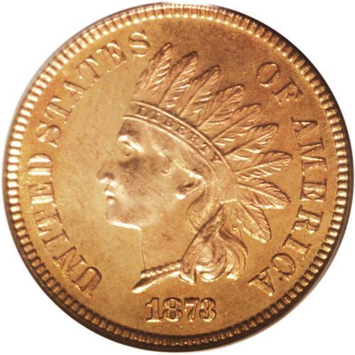 <B>1873<1C> Closed 3 PR65 Red PCGS.</B></I> The Bowers Indian cent reference (an underrated and valuable text) estimates that only about 2 million out of the nearly 12 million cents made this year were of the Closed 3 variety. Original, brilliant red business strike specimens are very rare, and this rarity has pushed up demand and prices for red proof specimens, all of which were made from the Closed 3 proof dies early in the year. This lovely piece has brilliant, well mirrored yellow-gold fields, complemented by devices that have just a whisper of purplish-red. Population: 28 in 65 Red, 3 finer (7/06).