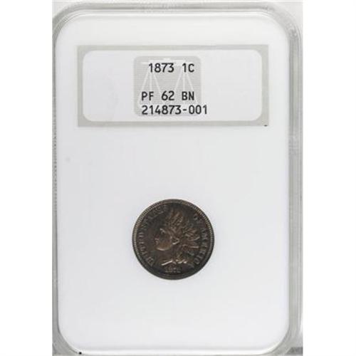 <B>1873 1C Closed 3 PR62 Brown NGC.</B></I> NGC Census: (2/137). PCGS Population (4/183). Mintage: 1,100. (#2307)<BR><BR><B>Coin Engraver:</B> James B. Longacre<BR><BR><b>Shipping:</b> Coins & Currency (<a target="_blank" href="http://www.heritageauctions.com/common/shipping.php">view shipping information</a>)