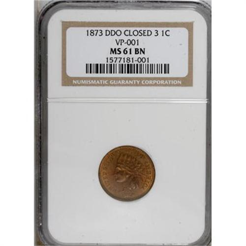 <B>1873 1C Doubled LIBERTY MS61 Brown NGC.</B></I> FS-009, Snow-1, VP-001. The closed 3. <I>The Cherrypickers' Guide</B></I> says: "This is considered the 'chief' of the Indian Cent varieties. Demand for this variety is very high, and it can be sold easily." LIBERTY is strongly doubled, as is the eye, the upper lip, and the feather spines. Considerable coppery-gold luster is visible on this specimen. Generally well struck, though the second diamond from the top is weak. A few handling marks are evident, including a light scratch in the lower right obverse field.<BR><BR><B>Coin Engraver:</B> James B. Longacre<BR><BR><b>Shipping:</b> Coins & Currency (<a target="_blank" href="http://www.heritageauctions.com/common/shipping.php">view shipping information</a>)