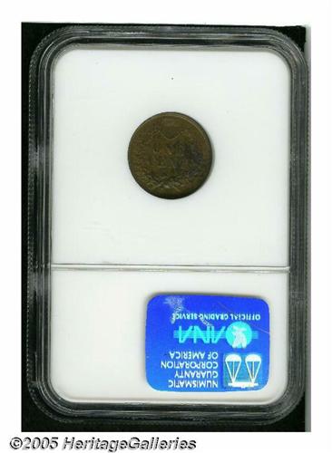 <B>1873<1C> Doubled LIBERTY MS62 Brown NGC.</B></I> FS-009, Snow-1. This is the more desirable of the two known varieties of the doubled die 1873 Closed 3 Cent. Readily identifiable by bold obverse doubling on the letters in LIBERTY, Liberty's eye and profile, and the feather stems. Generally golden-brown in color, this well struck piece also possesses dashes of navy-blue toning on the right reverse, and a few small spots are noted near the first T in STATES.