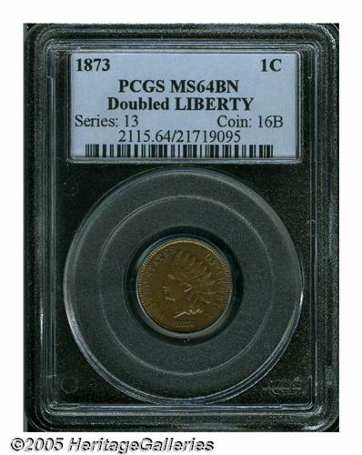 <B>1873<1C> Doubled LIBERTY MS64 Brown PCGS.</B></I> FS-009, Snow-1. In addition to the letters in the word LIBERTY, doubling is evident on Liberty's eye, lips, and nose tip. Now nearly a half century after its discovery, this variety's legitimate rarity and dramatic doubling has made it one of the most sought-after Indian Cent issues. Glossy brown surfaces are generally well struck and retain traces of faded sunset-orange color about the devices. An unobtrusive dig is well situated to the left of the shield on the reverse. This is a late die state of the variety with a die crack through the base of the date.