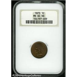 1873 1C Open 3 MS64 Red and Brown NGC. Lustrous or <B>1873 1C Open 3 MS64 Red and Brown NGC.</B></I> Lustrous orange-tan patina, and crisply struck motifs. A few minute marks are noted on the Indian's cheek. <BR><BR><B>Important notice:</B> Heritage usually auctions material at the rate of 200-250 lots per hour. On some occasions eBay Live bid software or the Internet may not be able to keep up with the pace of the auction. We recommend placing a realistic absentee bid now as insurance to avoid disappointment. Occasionally the auctioneer may eliminate or reject an eBay Live bid, and the auctioneer may also reopen a lot after the close of the eBay live bidding (usually because we missed an audience bid), and may reject your bid even if it shows you as the winning bidder. By bidding via eBay Live, you agree that Heritage may award the lot to another bidder at its sole discretion under the circumstances described above or any other reasonable circumstances. Since eBay bids are not shown to us until we open the lot on the floor, we treat those bids just like floor bids. In most cases the floor responds before the eBay bid is presented to us, due to Internet lag time, so for consistency we have made it a policy that floor bids are always considered first over tie eBay live bids. Also please note that all Heritage lots purchased through eBay Live carry a 20% Buyer's Premium. Please make sure you read the Terms and Conditions before you bid. This lot is being auctioned in conjunction with a live floor auction by Heritage Galleries & Auctioneers. All final auction and invoice information will be supplied by Heritage Galleries & Auctioneers, and all other information should be considered preliminary. Lot:5083