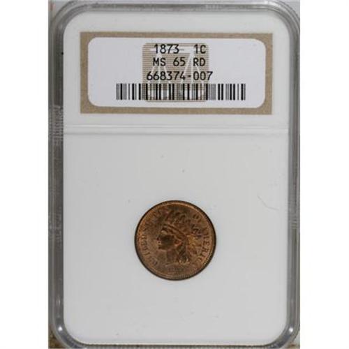 <B>1873 1C Open 3 MS65 Red NGC.</B></I> The modified 3 in the date was done after January 13, 1873, when Chief Coiner Archibald Louden Snowden made a formal complaint about the similarity between the 3 punch that was used in the date and an 8. Full red coins are scarce of both varieties, but the Open 3 is slightly more available. This piece shows rich pinkish-tinged red surfaces and bright fields. Sharply struck on the obverse, only the top of the shield on the reverse shows any signs of weakness. Census: 6 in 65, 1 finer (6/07).<BR><BR><B>Coin Engraver:</B> James B. Longacre<BR><BR><b>Shipping:</b> Coins & Currency (<a target="_blank" href="http://www.heritageauctions.com/common/shipping.php">view shipping information</a>\)