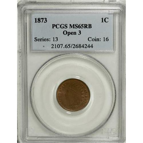 <B>1873 1C Open 3 MS65 Red and Brown PCGS.</B></I> Bold N in ONE. A handsome Gem with medium brown centers and lighter gold margins. Satiny and exquisitely struck. Essentially void of contact, although a faint fingerprint fragment is found at 7 o'clock.<BR><BR><B>Coin Engraver:</B> James B. Longacre<BR><BR><b>Shipping:</b> Coins & Currency (<a target="_blank" href="http://www.heritageauctions.com/common/shipping.php">view shipping information</a>)
