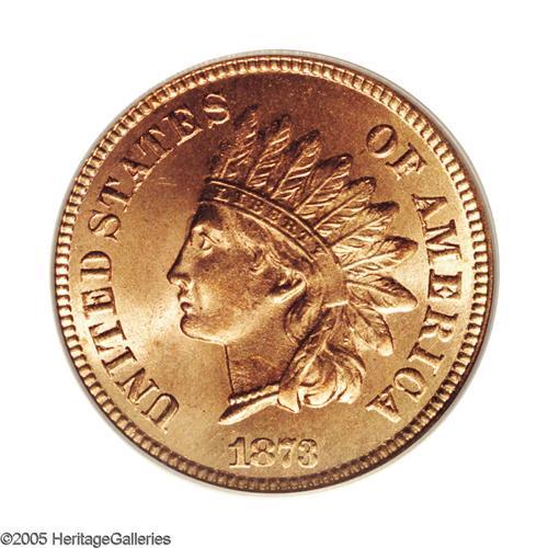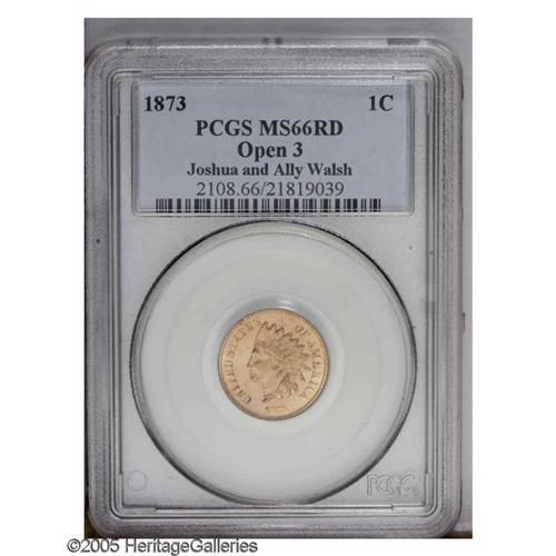 <B>1873<1C> Open 3 MS66 Red PCGS.</B></I> The relatively low mintage for the 1873 issue is further divided into Closed 3, Open 3, and Doubled LIBERTY varieties. While the Open 3 is not rare in lower grades, only a tiny fraction of the survivors can match the reddish-copper and golden-copper color and exquisite surfaces of the present lustrous Gem. Well struck with immense eye appeal. For pedigree purposes, an opaque toning spot is seen within the O of ONE. Population at both services combined: 5 in 66, none are finer (11/05).<BR><I>From The Joshua and Ally Walsh Collection of United States Cents.</B></I>