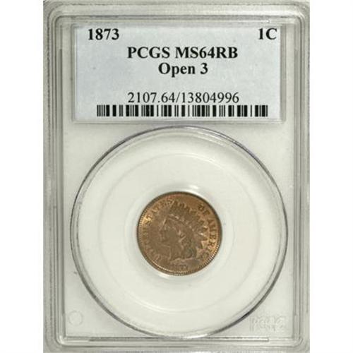 <B>1873 1C Open 3 MS64 Red and Brown PCGS.</B></I> PCGS Population (156/45). NGC Census: (51/64). Mintage: 11,676,500. Numismedia Wsl. Price for NGC/PCGS coin in MS64: $525. (#2107)<BR><BR><B>Coin Engraver:</B> James B. Longacre<BR><BR><b>Shipping:</b> Coins & Currency (<a target="_blank" href="http://www.heritageauctions.com/common/shipping.php">view shipping information</a>)