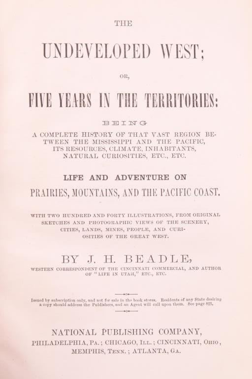 Featured in this lot is this 1873 first edition copy of “The Undeveloped West” or “Five Years in the Territories: A complete history of that vast region between the Mississippi and the Pacific, its resources, climate, inhabitants, natural curiosities, Etc., Etc.” The condition of this book is fair, with wear and slight browning to the pages consistent with the age of the book. The measurements of this book are 8 3/4" x 6".