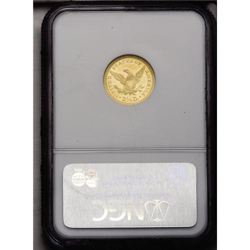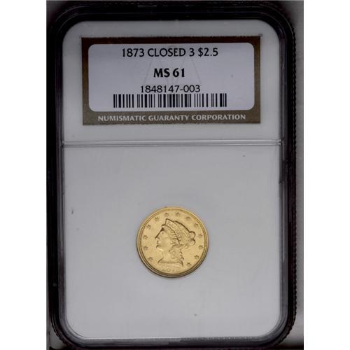 <B>1873<$2 1/2> Closed 3 MS61 NGC.</B></I> Yellow-gold surfaces are bright and lustrous and display sharply struck motifs. Small contact marks and luster grazes are noted on Liberty's cheek and neck and in the fields.