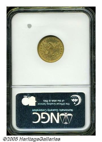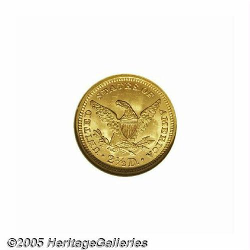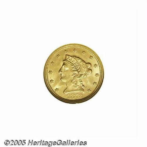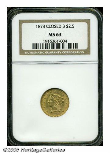 <B>1873<$2 1/2> Closed 3 MS63 NGC.</B></I> A moderately scarce issue but three or four times more difficult to locate than the Open 3. This piece is well struck except on the eagle's left leg, and the surfaces exude thick mint frost that has taken on a deep yellow-gold patina. One of 30 pieces to have been so graded by NGC (5/05) with 30 in higher grades.