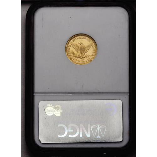 <B>1873<$2 1/2> Closed 3 MS63 NGC.</B></I> One of 55,200 Closed 3 business strikes that were produced, most survivors being in VF or XF grades. Mint State coins are elusive. Indeed, NGC and PCGS combined have graded just 90 pieces in MS63, the grade level of the piece we offer here, and 74 specimens finer (5/06). Both sides are awash in brassy-gold luster, and the design features are well struck, though the eagle's legs are a tad soft. A few grade-limiting marks are seen over each side. What appears to be a light grease streak occurs between the TY of LIBERTY.